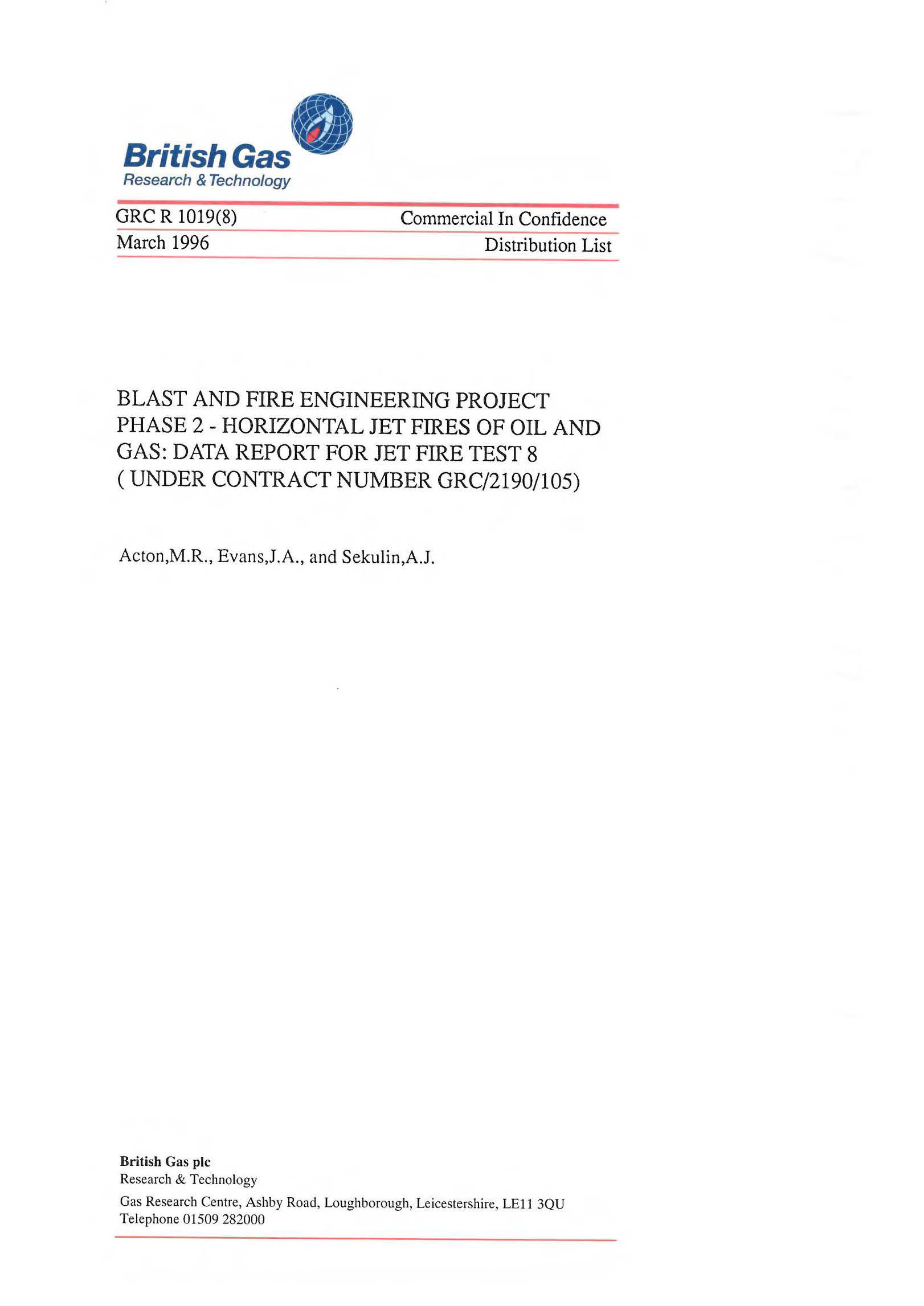 A programme of jet tire tests was undertaken by British Gas over a two-month period, between May and June 1995, under contract to the Steel Construction Institute as part of the industry sponsored ‘Blast and Fire Engineering Project for Topside Structures’. An overview report has been prepared which describes the measurement techniques and equipment used. The overview report also contains a summary of the data from each of the tests. In addition, an individual data report has been prepared for each test. This data report contains the detailed results of measurements taken during Test 8.