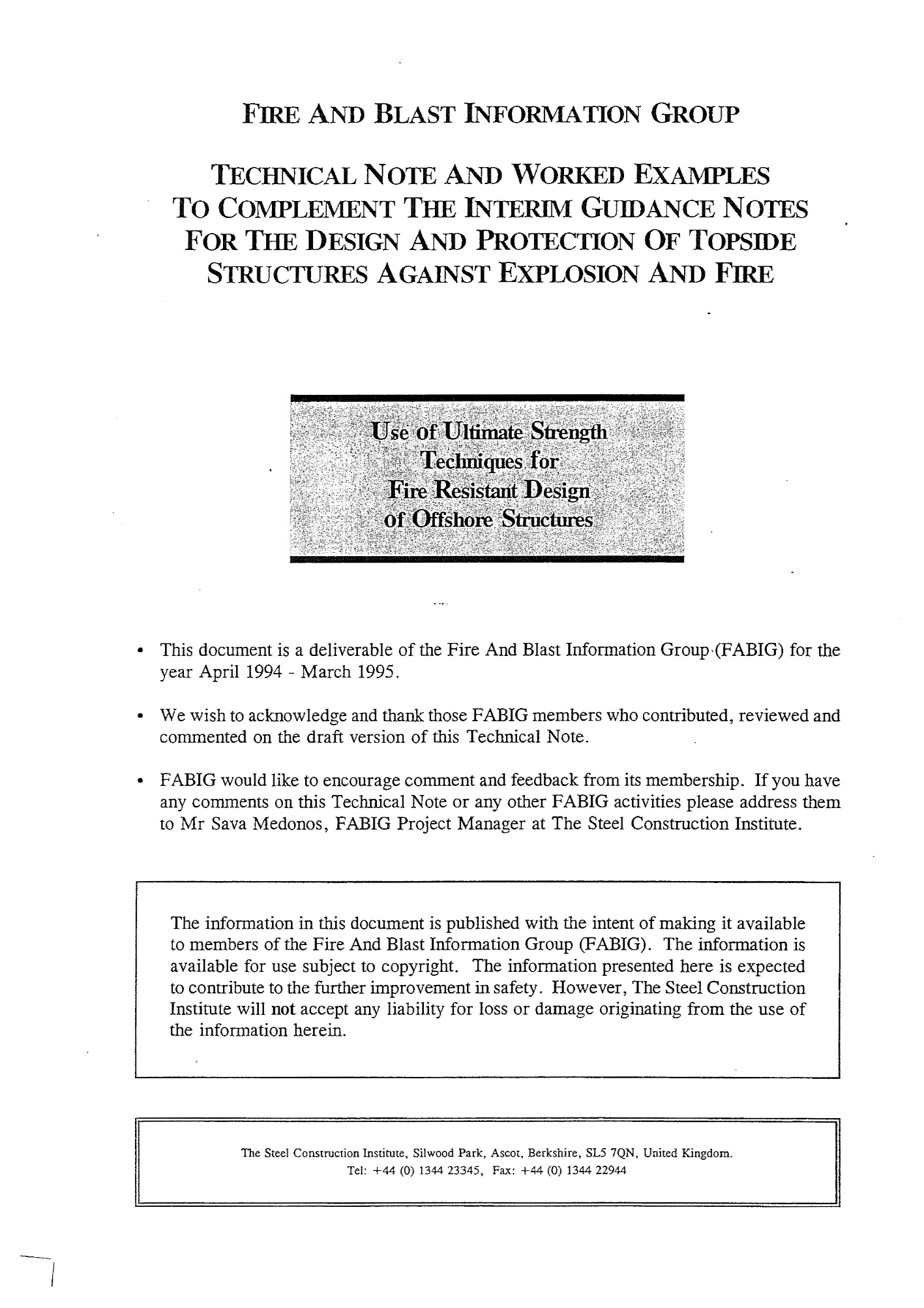 The document considers in turn the setting of performance standards to meet the present goal setting approach to safety on offshore installations, the thermal response of structures and components, the strength response of structures and components, combined effects and finally examples describing various approaches.